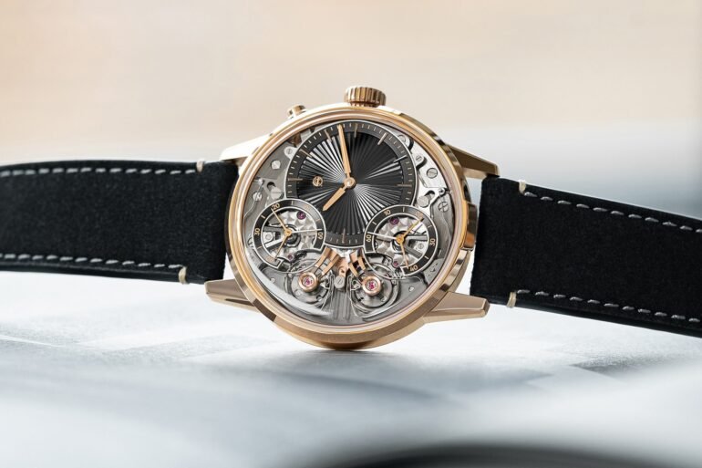 The watch is a lavish contemporary composition with a completely different look than its predecessor. That watch, the cool, collected, and very technical-looking Mirrored Force Resonance Ice Blue, came in a steel case and featured a frosty blue dial. The warm hue of the rose gold, in combination with a deep black dial, results in a lavish, harmonious blend of traditional design features and modern watchmaking.