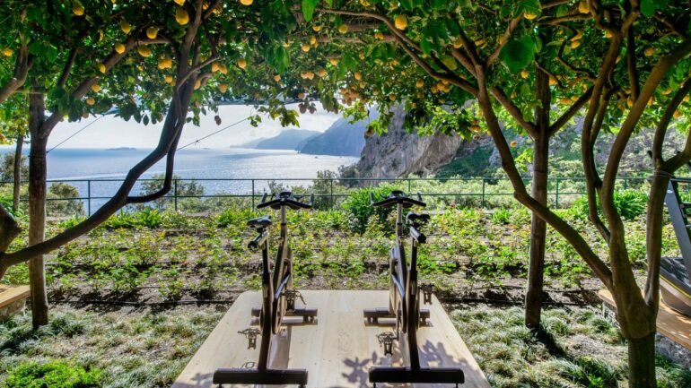 Running on a treadmill or riding a stationary bike goes from dreary to dreamy when you’re surrounded by lemon trees and overlooking the scintillating Amalfi Coast. That’s exactly what you’ll find at Il San Pietro’s leafy outdoor gym where you can do cardio and strength exercises with sweeping sea views from the hotel’s clifftop location. Open from 8 a.m. until 8 p.m. and reserved exclusively for hotel guests, the space is particularly enchanting during sunrise and sunset, when Positano glows and boats drift across the sparkling water below. This workout setting turns your gym routine into something truly unforgettable.