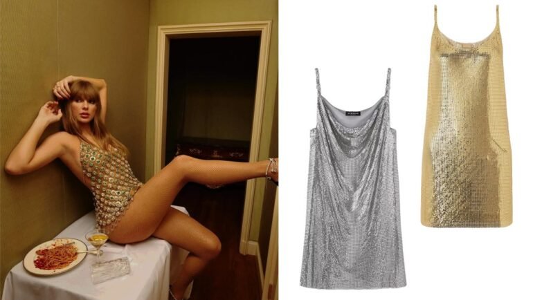 Unfortunately, the exact handmade dresses worn by T.Swift in this instance are unattainable, but (much like you can grab her album vinyl on Amazon, add her lipstick-of-choice to cart, and snag some fan-made “Life of a Showgirl” merch while you’re at it) it’s still very possible to replicate Swift’s sultry showgirl aesthetic with the help of luxe chainmail dresses online.