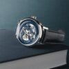 At 10 o’clock, you’ll find the earthphase indicator, Swatch’s twist on celestial timekeeping. Instead of showing how the Moon appears from Earth, it shows how Earth appears from the Moon. When we see a full Moon, someone standing on the Moon would see a “new Earth,” and vice versa.
