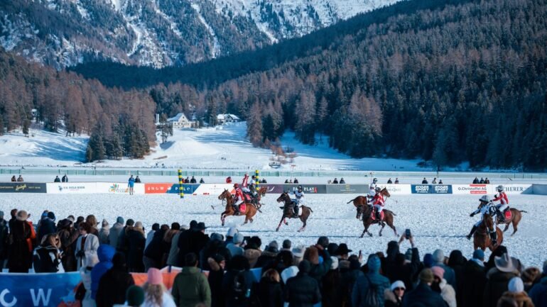 As we continue to watch the match, Borwick explains that polo has had periods of peaks and troughs throughout time, popular in the 80s, then again in the early 2000s. He believes we’re now witnessing another revival, which he hopes will lend to a deeper understanding of the sport on a global scale (according to Swiss tourist accommodation statistics, American overnight guests in St. Moritz over the month of January surged from 6,931 in 2023 to 9,810 in 2025). Upon spotting Gstaad Guy in the crowd, I realize it helps, of course, that the event is a content creation jackpot.
