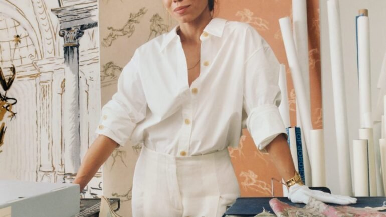 Nathalie Ebel poses in front of Palazzo Panel Set inspired by Schumacher archival designs.