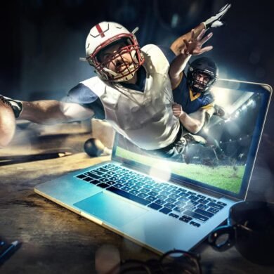 Collage about american football players in dynamic action with ball in a professional sport game. They playing from laptop. 3D...