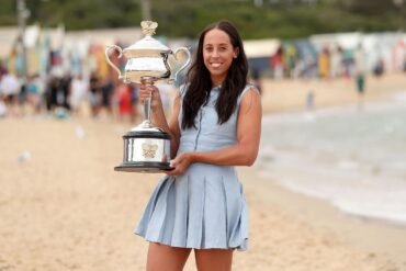 Madison Keys poses with the Daphne Akhurst Memorial Cup after winning the 2025 Australian Open, January 26, 2025 in Melbourne,...