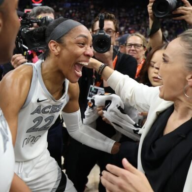 PHOENIX, ARIZONA – OCTOBER 10: A’ja Wilson #22 of the Las Vegas Aces celebrates with head coach Becky Hammon after...