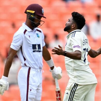 India’s Mohammed Siraj (R) celebrates after taking the wicket of West Indies’ captain Roston Chase (L) during the first day...