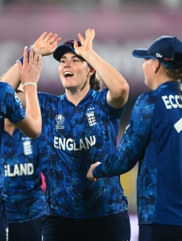 GUWAHATI, INDIA – OCTOBER 07: Lauren Bell of England is congratulated by team mate Nat Sciver-Brunt after taking the catch...