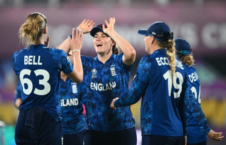 GUWAHATI, INDIA – OCTOBER 07: Lauren Bell of England is congratulated by team mate Nat Sciver-Brunt after taking the catch to dismiss Marufa Akter of Bangladesh (not pictured) during the ICC Women’s Cricket World Cup India 2025 match between England and Bangladesh at Barsapara Cricket Stadium on October 07, 2025 in Guwahati, India. (Photo by Matt Roberts-ICC/ICC via Getty Images)