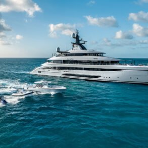 Ultimately, a support/shadow yacht carries a plethora of watercraft. The Extra X70 Shadow yacht has more than enough space for a mini armada. Her long, open aft deck affords 430 square feet (40 square meters) for toting a wide variety of PWCs, tenders, watertoys, and land craft. For example, Extra Yachts says there’s enough space for a 17-foot (5.2-meter) jet tender alongside two waterbikes and two motorcycles. Another option is a 21-foot (6.5-meter) sailboat and two waterbikes (closeup below). Either way, a stowage compartment lets you tuck away more toys, like SeaBobs, SUPs, foiling surfboards, and more.