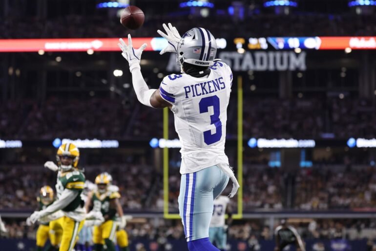 ARLINGTON, TEXAS – SEPTEMBER 28: George Pickens #3 of the Dallas Cowboys catches a pass for a touchdown against the Green Bay Packers during the second quarter in the game at AT&T Stadium on September 28, 2025 in Arlington, Texas. (Photo by Sam Hodde/Getty Images)