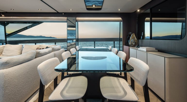 The series is the newest in an overall flying-bridge range redesign. In 2018, Ferretti Yachts set out to restyle its popular Flybridge offerings, gradually introducing a new family look. The latest, and last, model with the new profile is the Ferretti Yachts 800 yacht, one of eight Flybridge models overall. The new looks largely focus on lessening real and perceived barriers between the onboard experience and the surrounding seascapes. So, for instance, walls of glass wrap around the 80-footer’s (24.5-meter’s) main-deck leisure areas. In fact, an optional sliding glass door to starboard in the dining area easily could become the most frequently requested feature. Either way, the 19-foot (nearly 6-meter) beam looks and feels more open and airy.