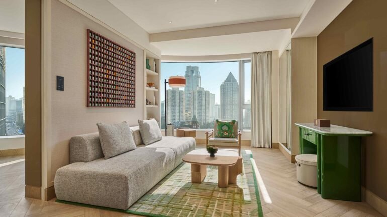 Motifs of the city’s past, and present, can be found in the rooms, the destination restaurants, the rooftop bar and the open, neighborhood style corridors. A glass-brick feature wall and moss-hued rugs are inspired by Shanghai’s laneways, where European-style low rise buildings date back more than a century.