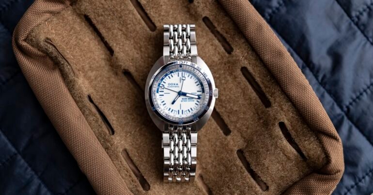 Priced at $2,990, this limited edition Doxa includes both a navy blue rubber strap and a full steel “Beads of Rice” bracelet with a fold-over clasp and push-button micro adjustment.