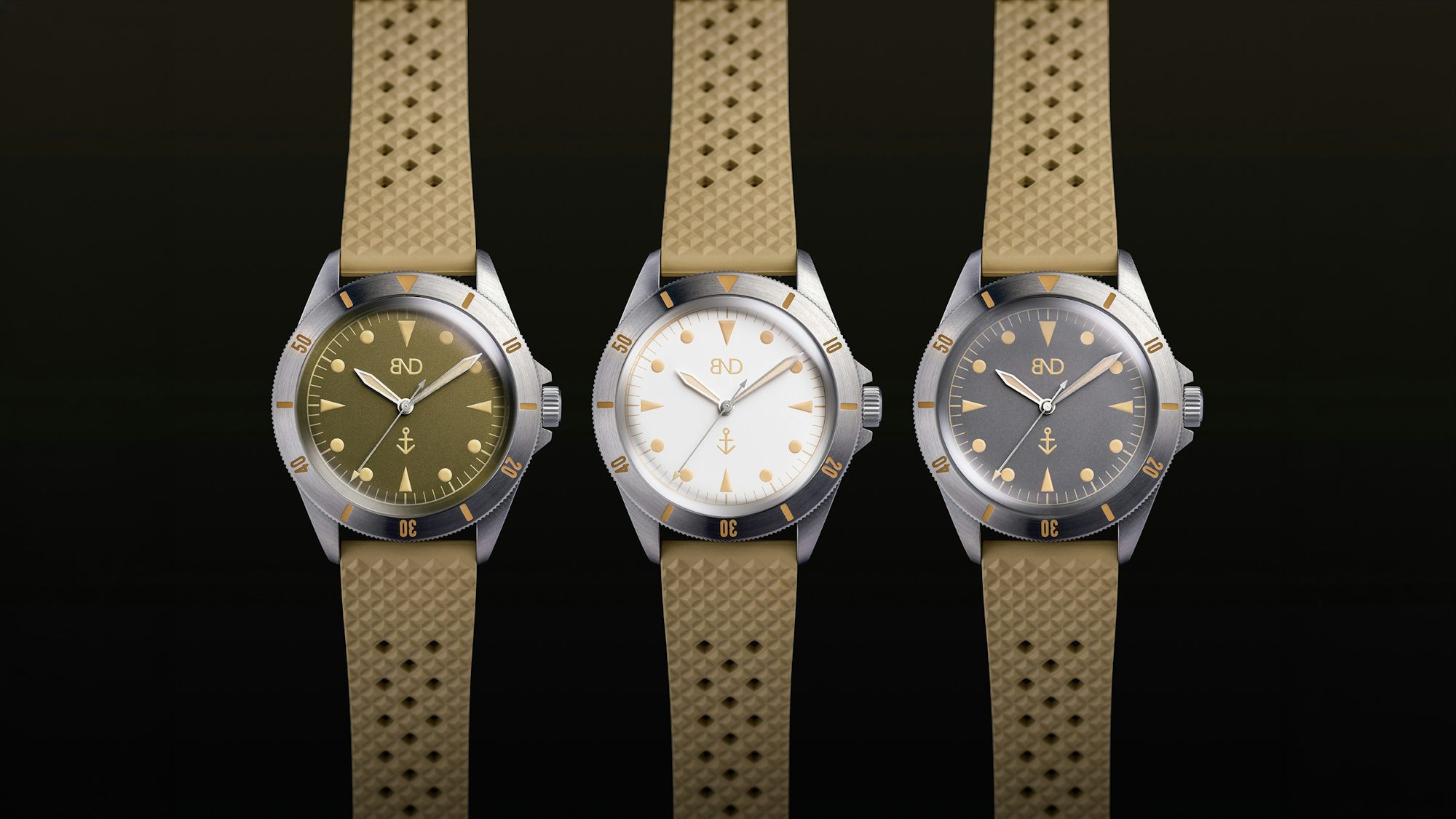 Just like the no-frills approach to the BND, I’ll keep the story short and sweet. Bonnaud took the vowels from his name, leaving BND, which he turned into the name and logo for his brand (reversing the B). The anchor on the dial of the very heavily vintage-inspired release is a clue to Bonnaud’s passion for dive watches, as is the name of the reference “MN” (like Marine Nationale, the French Navy, whose issued watches have become so collectible). The references, MNGRA, MNWHI, and MNKHA, are all named after the color options for the dials (shown above), which are accented by Super-LumiNova in their “Old Radium” hue.