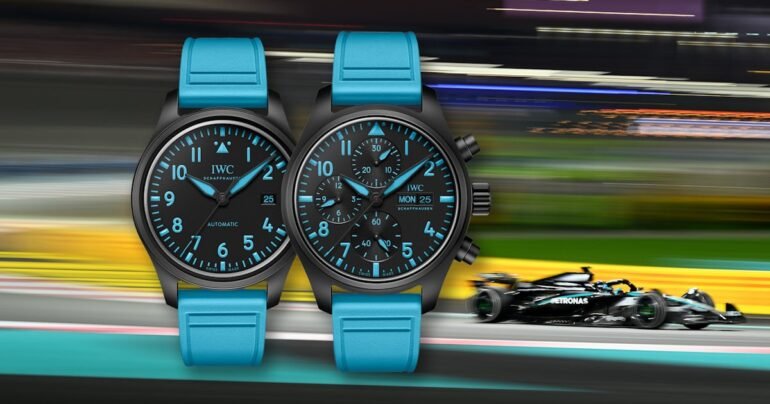 Both watches are delivered on blue rubber straps that match the dial accents and are fitted with IWC’s EasX-change system, allowing quick, tool-free strap swaps. Each model is limited to 1,063 pieces, a nod once again to Russell’s number. The Chronograph retails for $12,800, and the Automatic for $8,900.