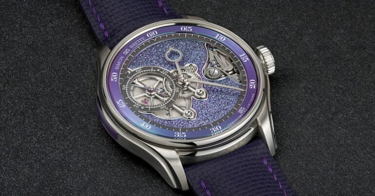 The dial, which here gets its most outrageous treatment yet, is only part of the story. Still, even there, there are some thoughtful touches, such as purple-blue accents that hold the screws for the keyless works, carrying the purple tones across the dial and into the openworked sections. The movement is the same as in past releases, with dual barrels providing 72 hours of power reserve, an oversized balance with variable-inertia adjustable weights, beats at 18,000 VpH, a hairspring shaped with a Breguet terminal curve, and a visible S-shaped stop balance.