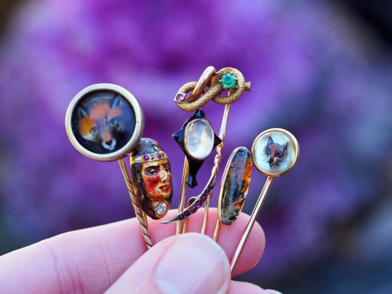 “I’ve been collecting for ten years. I started working for an estate jeweler (who I still work for today) in my hometown in 2015. I grew up with the owner’s daughters, who were a bit older than me. My family went on beach vacations with them every year until one summer when the two daughters met some cute boys on the beach who invited them out later that night. Despite the fact that I was a younger, chubby pre-teen, I BEGGED them to take me with them on their late night outing (the band Hanson was doing all sorts of things to my hormones at the time). They relented and we snuck out to meet them after our parents and my brothers went to bed (or so we thought). We got caught coming back late at night. We didn’t have cell phones (it was the late 90s) and they had no idea where we were. It was a huge deal. After that night we stopped going on vacations together and I really lost touch with them until I hit my mid 20s. I crossed paths with them because our parents still kept in touch, and I started babysitting for the young kids of one of the daughters. The owner of the store happened to be there one night after babysitting and he offered me a job taking pictures for their eBay page. His company to this day buys jewelry & coins from the public and sells pieces on eBay as well as in their high-end showroom. I didn’t know a thing about jewelry (nor did I care a thing about jewelry), but after a couple of months I became enamoured with antique jewelry in particular. I couldn’t get over how cool Old European and Old Mine cut diamonds looked under a microscope, how relevant some of the motifs were to today, how detailed some of the pieces were, and how they still held up after decades and decades. From there it became an obsession, and I couldn’t stop collecting. The original owner of the store sadly passed away in 2023 at the age of 78, but now I work for his daughter, who decided to take over the family business.”