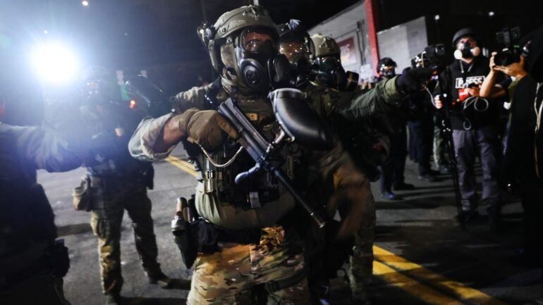 Federal agents, including members of the Department of Homeland Security, the Border Patrol, and police, attempt to keep protesters back outside a downtown U.S. Immigration and Customs Enforcement (ICE) facility in Portland, Oregon.