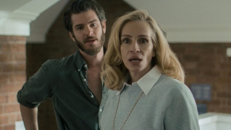 Andrew Garfield as Hank and Julia Roberts as Alma in “After the Hunt.”