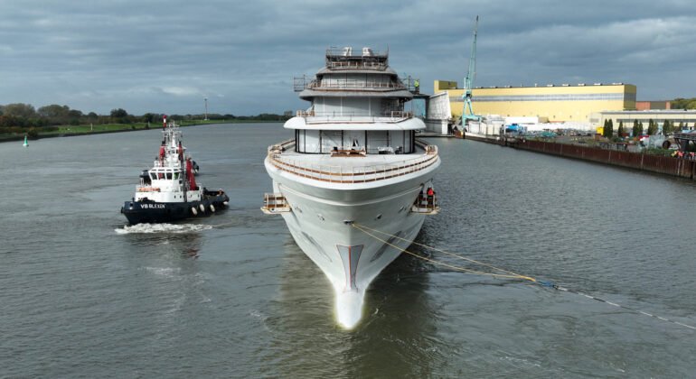 The float-out of a yacht is exciting for onlookers, especially since it’s the first time the full profile is visible. A significant-size Lürssen superyacht just emerged from her construction shed with the assistance of tugboats today. The code-named yacht Project Defy is one of the largest builds from the German yard to date, in fact.