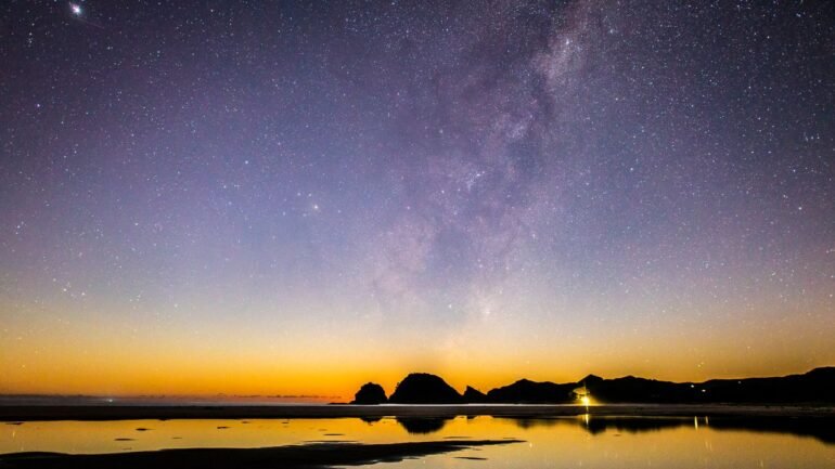 On an empty beach at the bottom of the world, the waves that roll over the sand are midnight blue and lit by the stars and a waxing moon. I’m only vaguely familiar with the constellations that hang above Great Barrier Island, known for centuries to the Māori as Aotea, some 56 nautical miles northeast of Auckland, New Zealand. I’m not all that used to seeing them so clearly, nor am I accustomed to the sense of unease that comes with being in a Dark Sky Sanctuary, as this place is, despite such proximity to a metropolis. Aotea profoundly lacks light pollution.