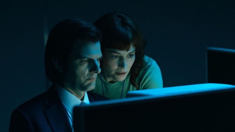 Adam Scott and Britt Lower in “Severance,” now streaming on Apple TV+.