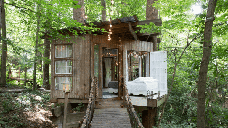 Just south of downtown, this four-bedroom (one king, one queen, and two rooms with two queens) Grant Park house sleeps 12, making it an ideal landing pad for large groups. With an oasis-like backyard comprising a pool, a hot tub, a firepit, and outdoor seating, you may never want to leave. The tastefully appointed home, with a full kitchen and Instagrammable decor (like neon signs and bright wallpaper), is within walking distance of neighborhood favorites like Ria’s Bluebird and Little Tart Bakeshop. Other attractions, like The Eastern (a concert venue) and the BeltLine, are a quick drive away.