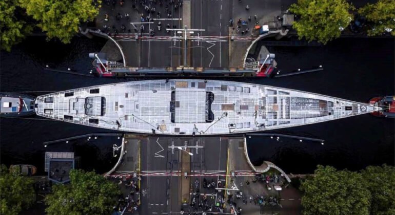 Project Zero (above and top) is especially worth noting for being a sailing superyacht without a combustion engine or diesel-consuming genset. In fact, this 226-foot (68.9-meter) performance ketch will employ only solar and wind energy for propulsion and electricity production. The “Zero” in “Project Zero” therefore refers to the lack of carbon emissions. Her hull already bears her full coat of paint—which we can’t show, since the last photos were from her loading in at Vitters in October 2023. However, expect new images in March, when Vitters has scheduled her load=out. Her owners are behind Foundation⁰ (Foundation Zero), which shares insights and data publicly on what’s possible with sustainable technology. That includes everything about this sailing superyacht’s design and operations, featuring contributions by Dykstra Naval Architects and Vripack, too.