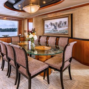 The main salon, spanning 40 square meters, integrates the dining area within a bright and refined environment. Large, floor-to-ceiling windows emphasize visual continuity with the exterior. The spatial layout provides a clear separation between convivial and private areas. For instance, access to the galley is via the pantry on the port side, while on the starboard side a lobby leads to the sleeping area and the owner’s suite.