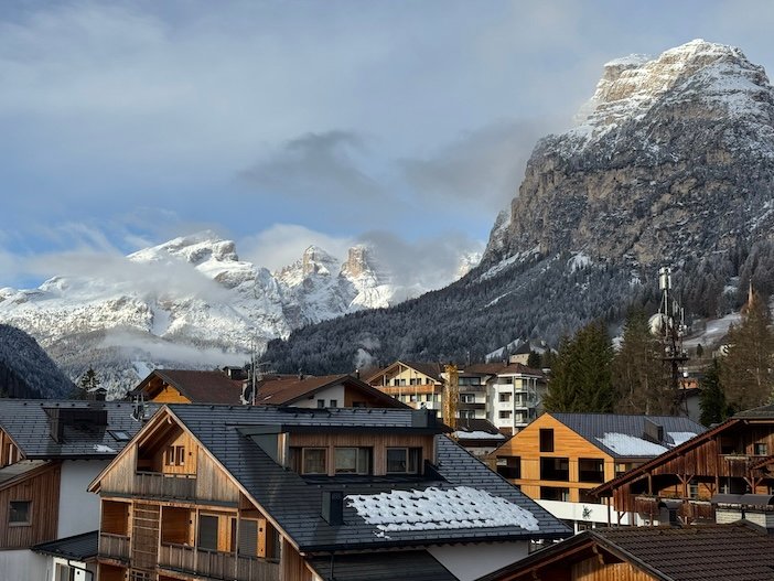 From my window in Hotel La Majun in the small village of La Villa, on the day before I had to return home, all I could see was falling snow. The fir trees that were green the day before when I was up the mountain now looked winter perfect in their new white coats. Hidden behind the snow-bearing clouds were the dramatic mountains of the north west Dolomites.