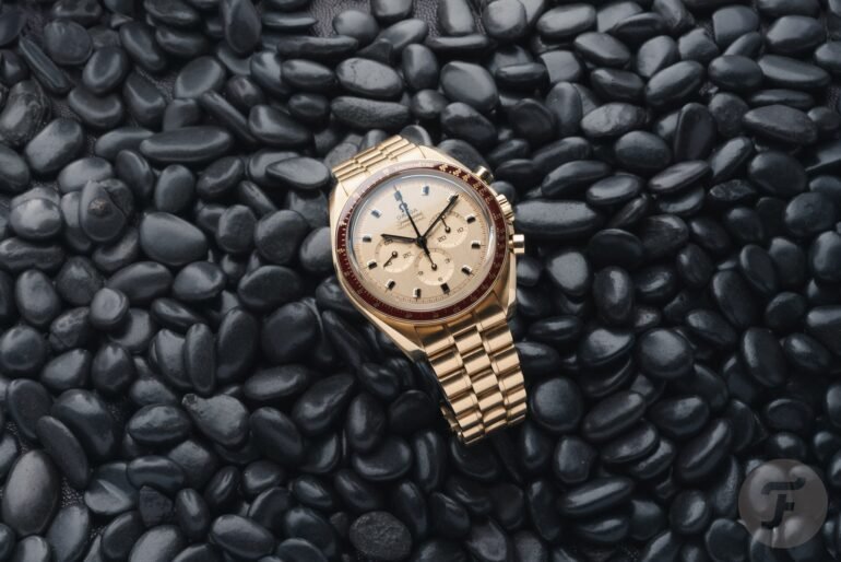 On RJ’s wrist today is the Speedmaster to rule them all, his Apollo 11 50th Anniversary model in 18K Moonshine Gold. He didn’t exactly trade in a big case full of Speedies for this one, but it’s still his grail for daily wear.