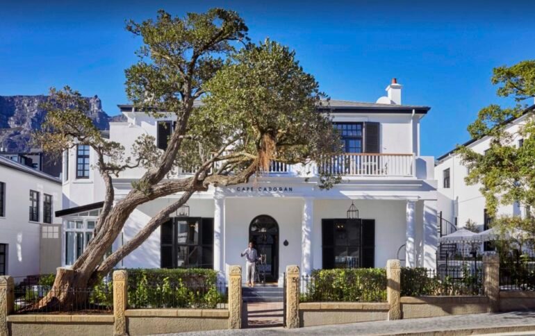 In a quiet, tree-lined street just off Cape Town’s vibrant Kloof Street, the Cape Cadogan Boutique Hotel rises in elegant contrast to the pulse of the city around it. Behind its whitewashed Georgian-Victorian façade lies a world of bold emerald, sharp gold, onyx black, and deep calm — a sanctuary that seems to hold its breath between the mountain and the sea.