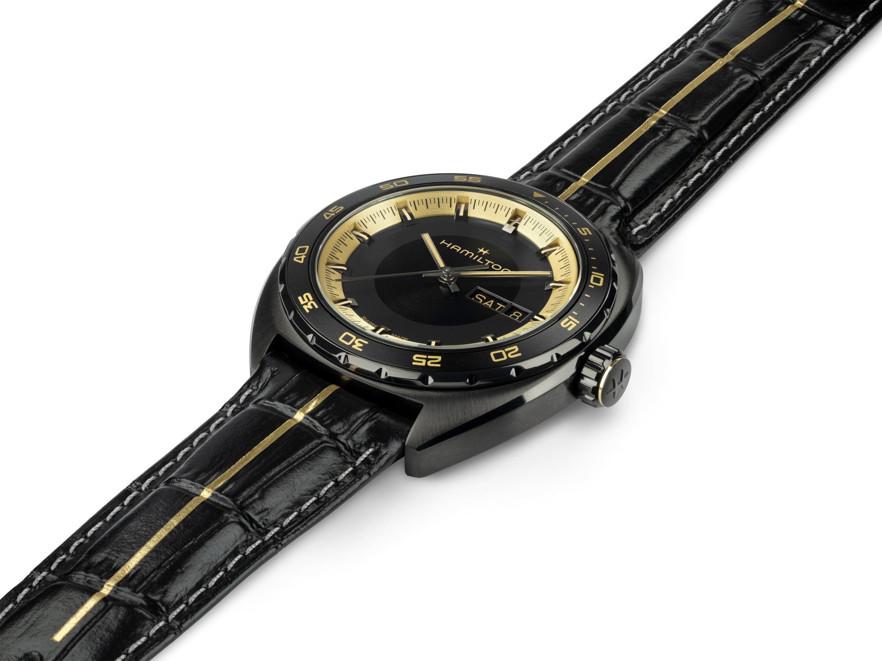 The black dial shows a circular-brushed finish, applied black indexes, and gold-colored Super-LumiNova. Additionally, the hour and minute hands, positioned underneath the sapphire crystal with an antireflective coating, received a touch of that luminous material. Inside the 50m-water-resistant case beats the automatic H-30, a 25-jewel movement featuring a day-date function, an 80-hour power reserve, and a Nivachron balance spring.