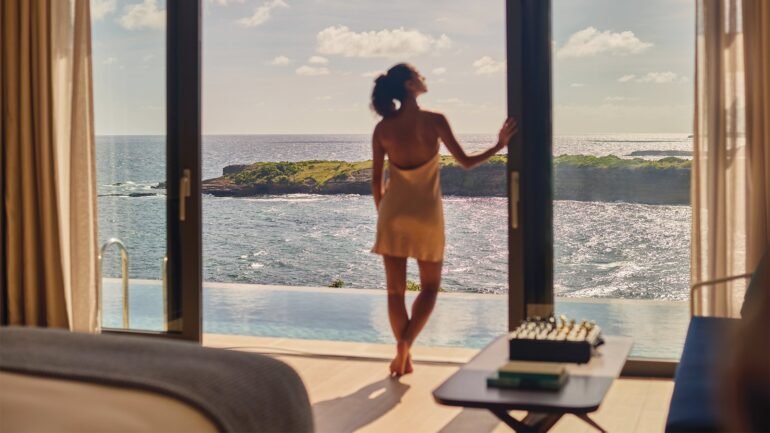 The 91 chic accommodations feel more like refined residences than resort rooms. Entry-level options start at a spacious 979 square feet, with floor-to-ceiling windows framing sweeping ocean views, generous terraces and soaking tubs. Beachfront villas elevate the experience further with private plunge pools, open-air living spaces and dedicated butler service.